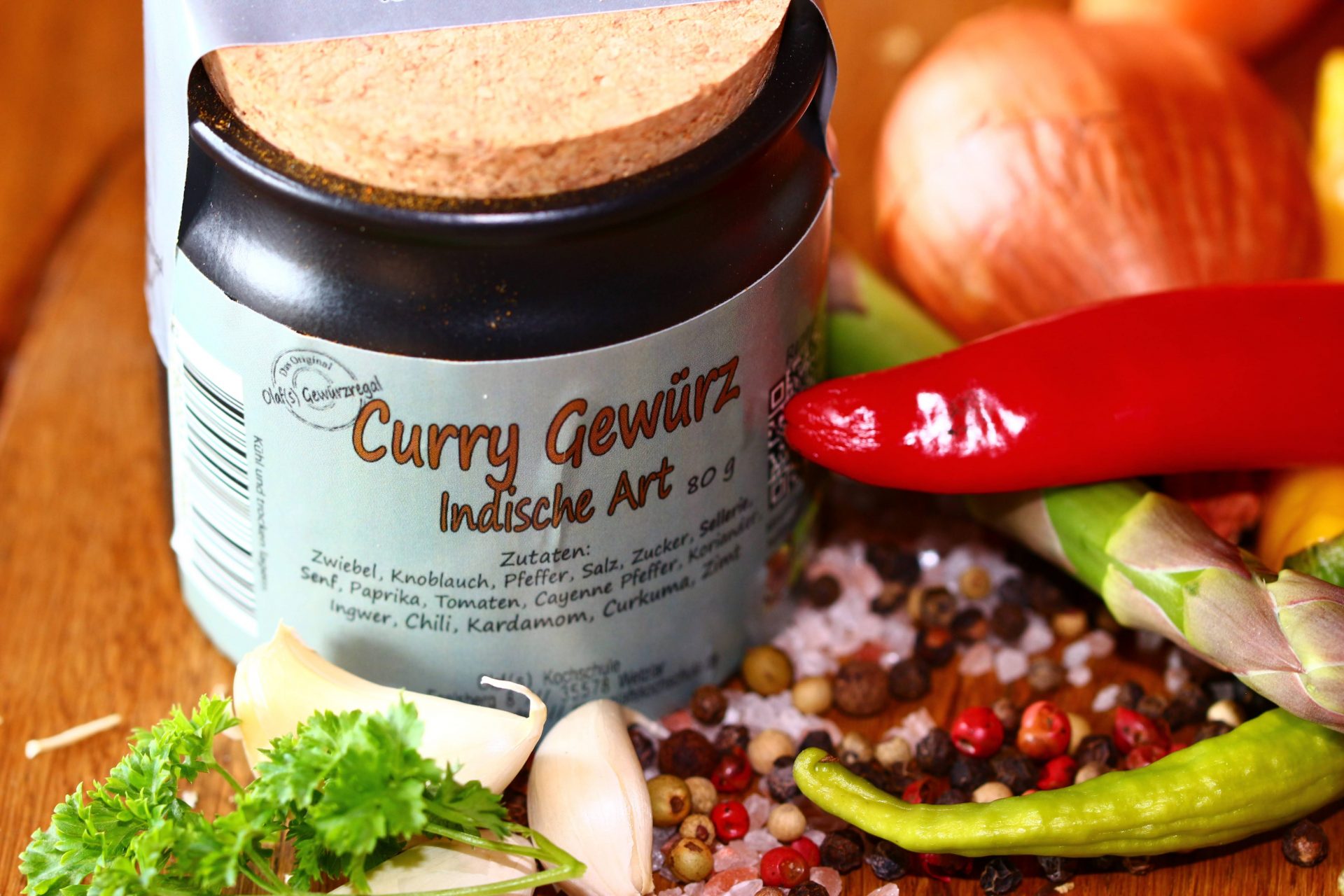 Curry Gewürzmischung indische Art aus der Serie von “Olaf(s) Gewürzregal”, fertige Gewürzmischung zum Herstellen von Curry Gerichten. Tolle Gewürzmischung mit 17 Gewürzen. Die Gewürzmischung wird mit einem Rezept verschickt, viel Spaß beim Kochen! 80 g Gewürzmischung im Keramiktopf.